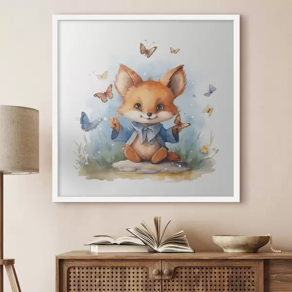 Plakat Mały lis w niebieskim garniturze siedzi na trawniku wśród latających motyli, ilustracja akwarelowa dla dzieci f39119