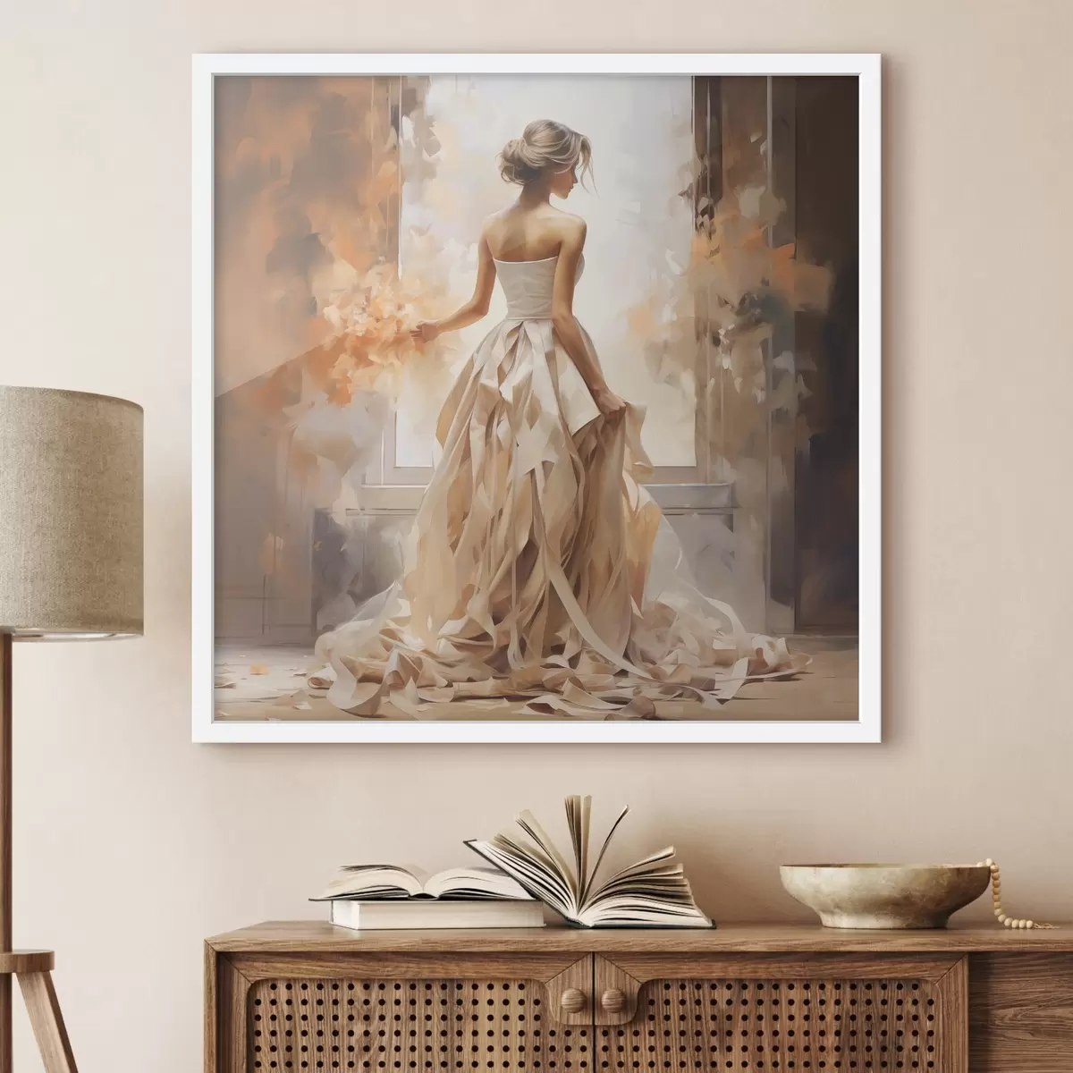 Plakat Dziewczyna w białej sukni ślubnej stoi przy oknie wśród ognia i maluje ręcznie f39125
