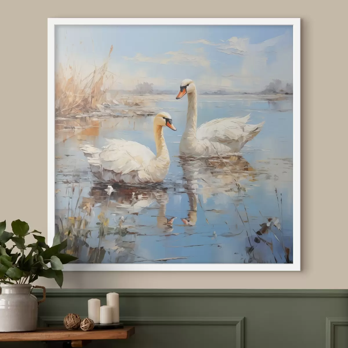 Poster Białe gęsi pływają wzdłuż rzeki wśród trzcin, niebieskie, białe, beżowe Nr f39130