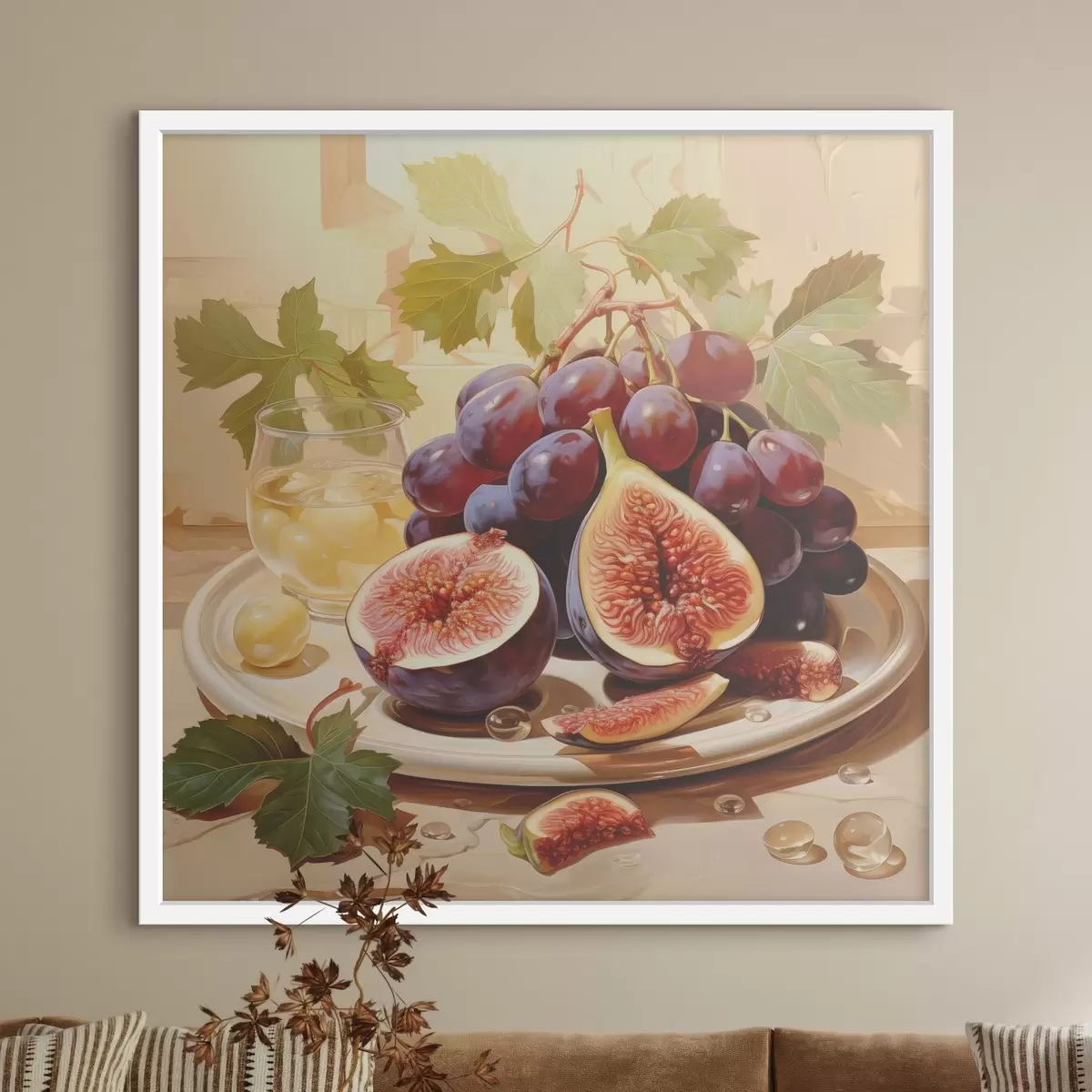 Plakat Martwa natura z niebieskimi winogronami i ciętymi figami na obrazie olejnym na desce, beżowo-różowa f39131