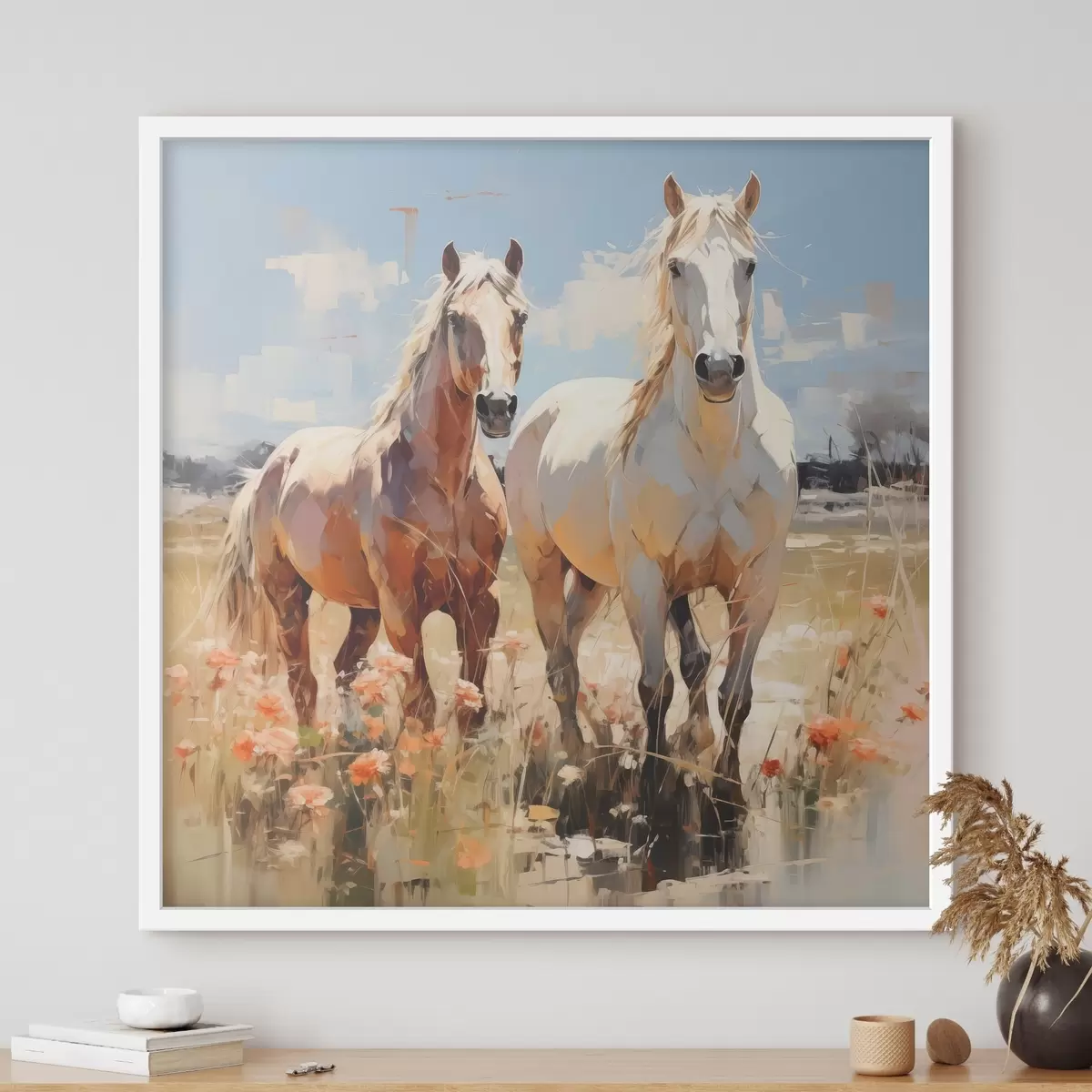 Plakat Białe i brązowe konie pasą się na łące wśród dzikich kwiatów, obraz olejny, sztuka abstrakcyjna f39187