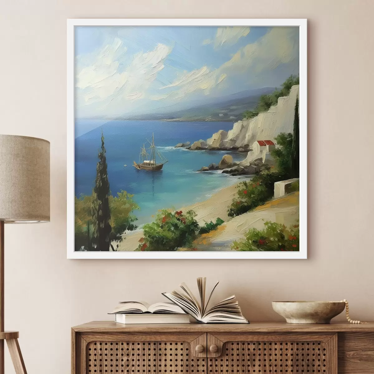 Poster Wybrzeże morskie Grecji, statek, błękitna woda, obraz olejny, letnia przyroda, skały, żywe pociągnięcia pędzla Nr f39425