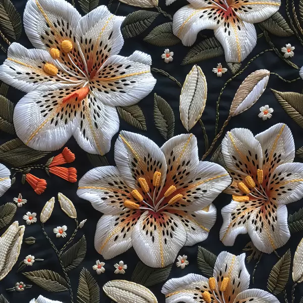 Plakat Haft typu Stumpwork: kwitnące lilie czarną nicią na ozdobnej tkaninie ze szczegółowymi dziełami sztuki f39650