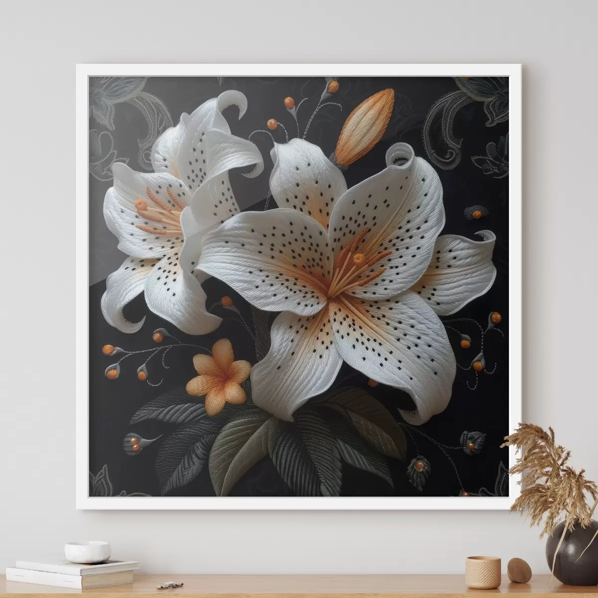 Plakat Haft Stumpwork: duże lilie wyszyte czarną nicią na dekoracyjnej tkaninie z misternymi detalami f39655