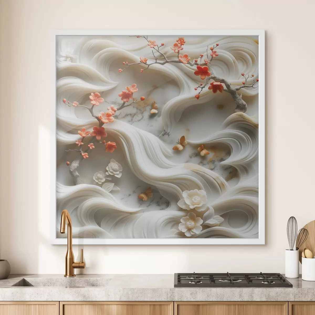 Poster Niebiańska scena ogrodowa 3D wyrzeźbiona w białym marmurze z płynącą florą i fauną Nr f39727