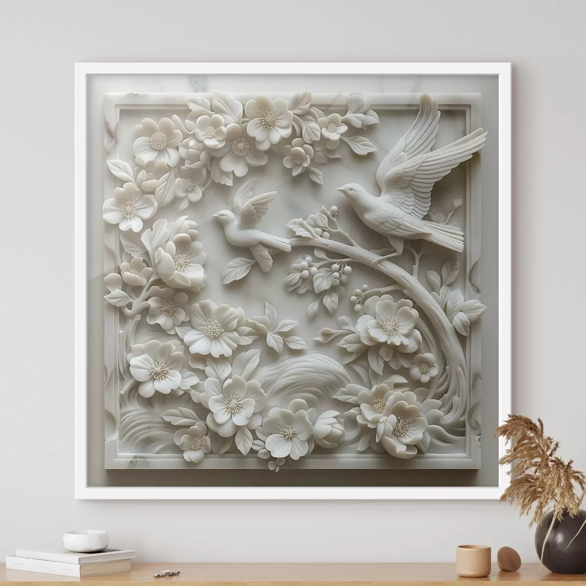 Poster Ogród z białego marmuru z płaskorzeźbami ptaków i kwiatów Nr f39728