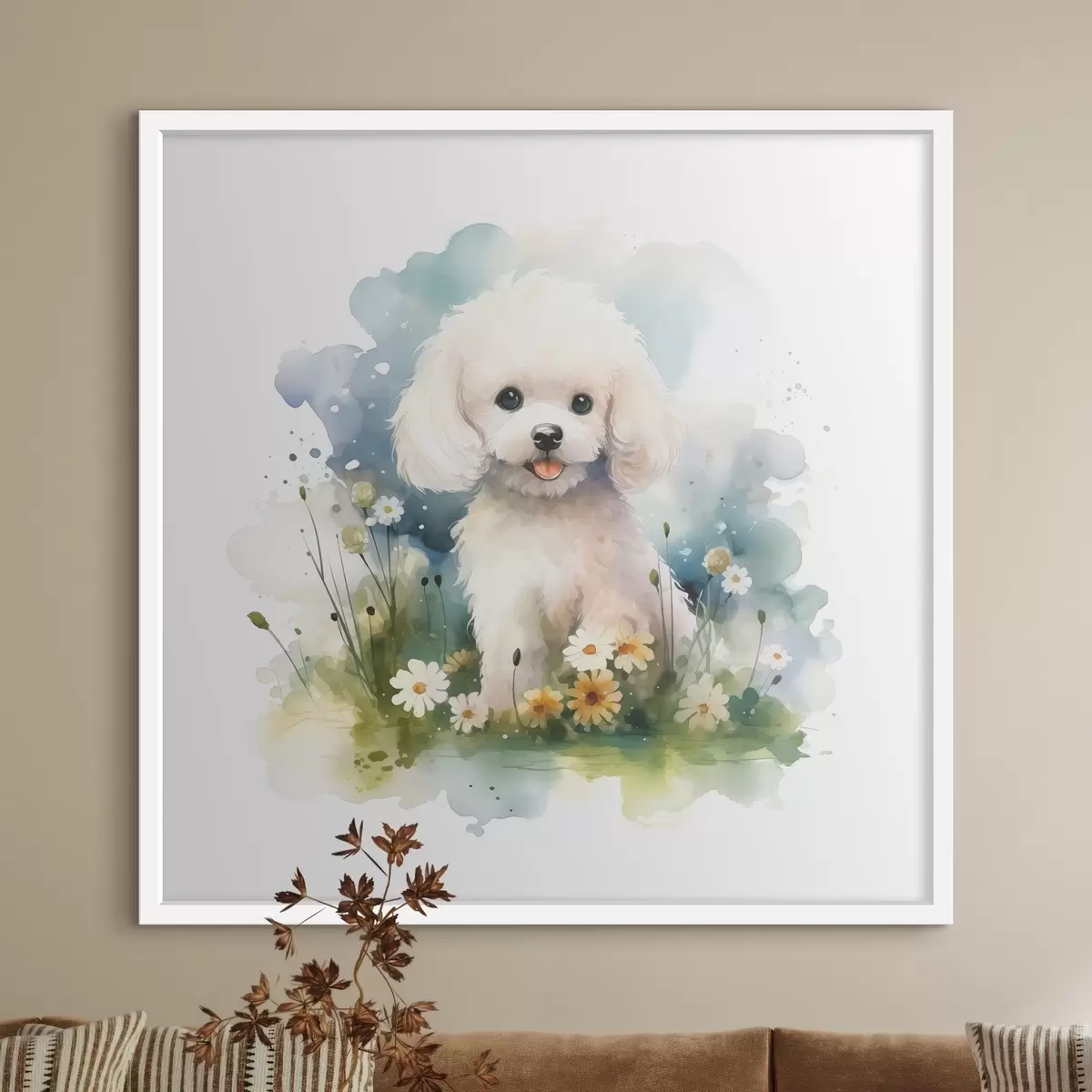 Poster Mały biały pudel siedzący w akwareli kwiatów Nr f39928