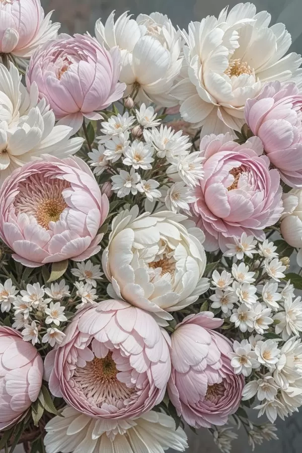 Plakat Bukiet z pastelowych różowych piwonii i białych stokrotek, ułożony w piękną kompozycję kwiatową f41255