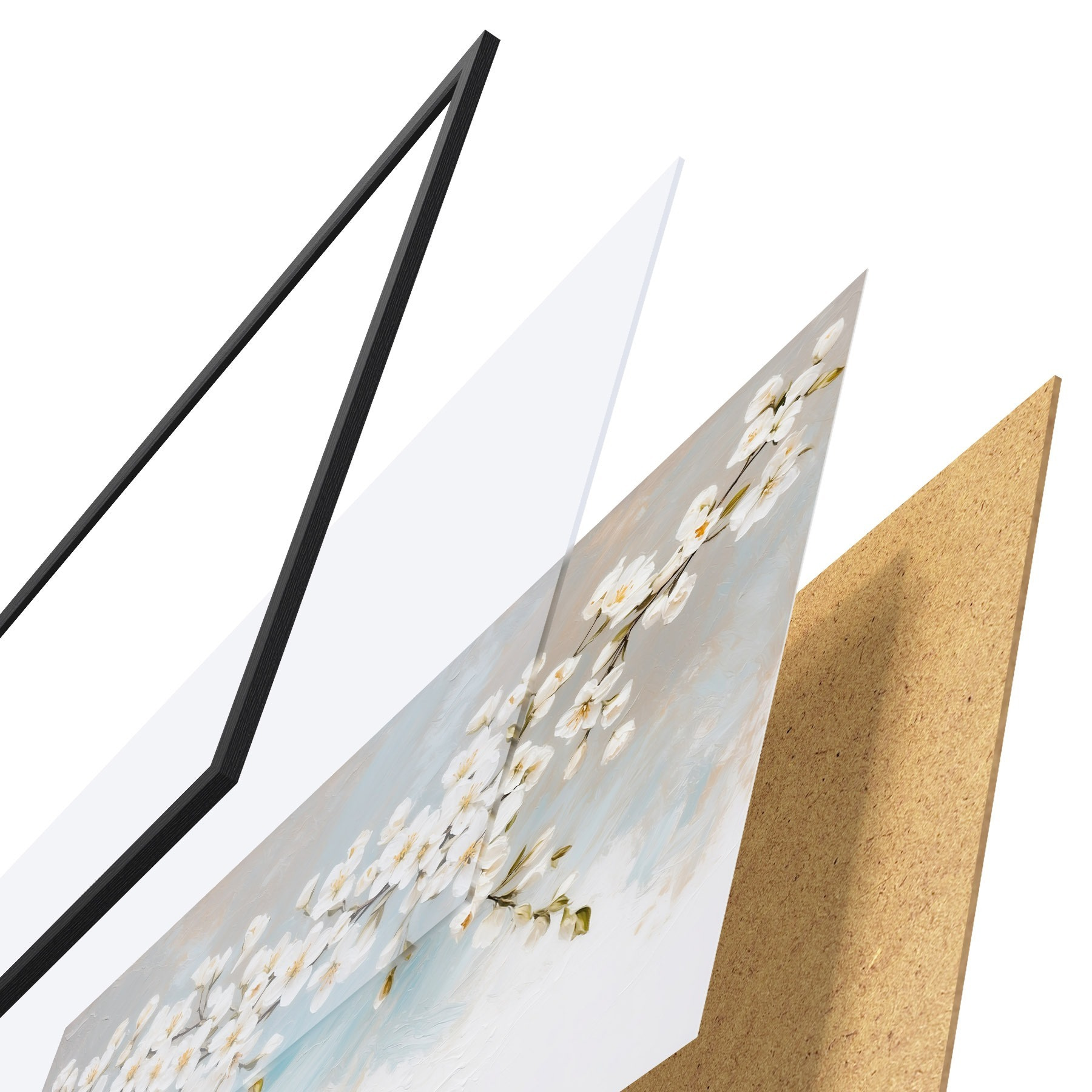 Plakat składa się z ramy, pleksi, wydrukowanego obrazu i podkładu z płyty wiórowej. Plakat można natychmiast zawiesić na ścianie dzięki uchwytom z tyłu.