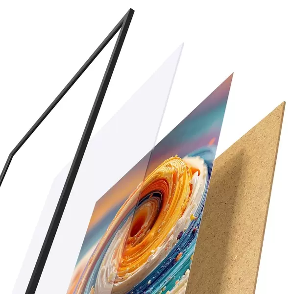 Plakat składa się z ramy, pleksi, wydrukowanego obrazu i podkładu z płyty wiórowej. Plakat można natychmiast zawiesić na ścianie dzięki uchwytom z tyłu.