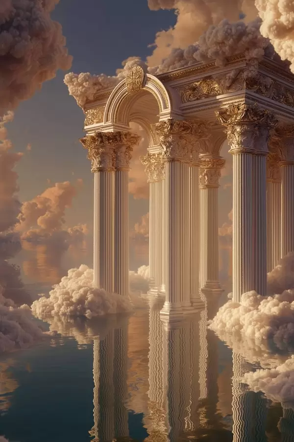 Poster Kolumny w chmurach, odbicia na wodzie Nr f45881