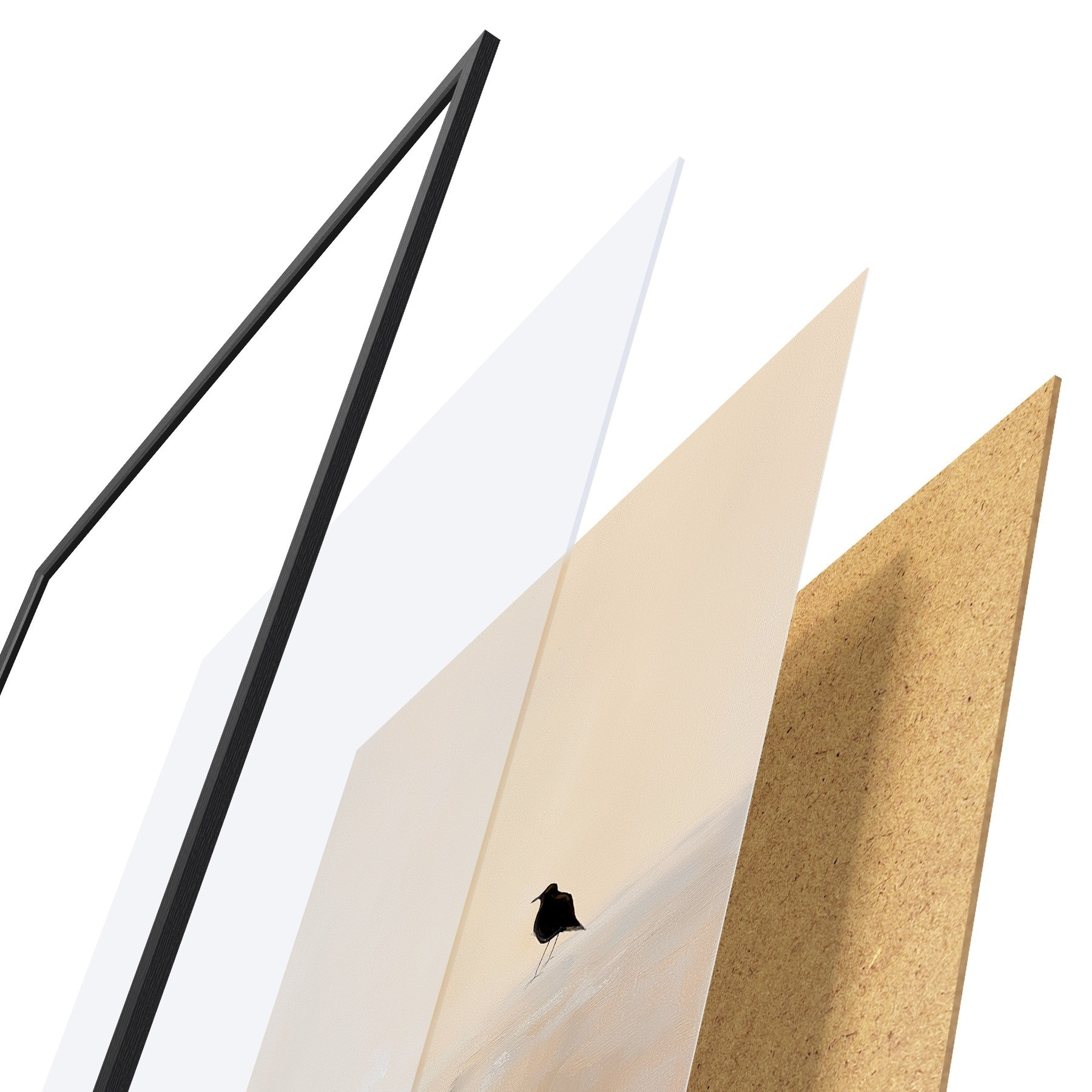 Plakat składa się z ramy, pleksi, wydrukowanego obrazu i podkładu z płyty wiórowej. Plakat można natychmiast zawiesić na ścianie dzięki uchwytom z tyłu.