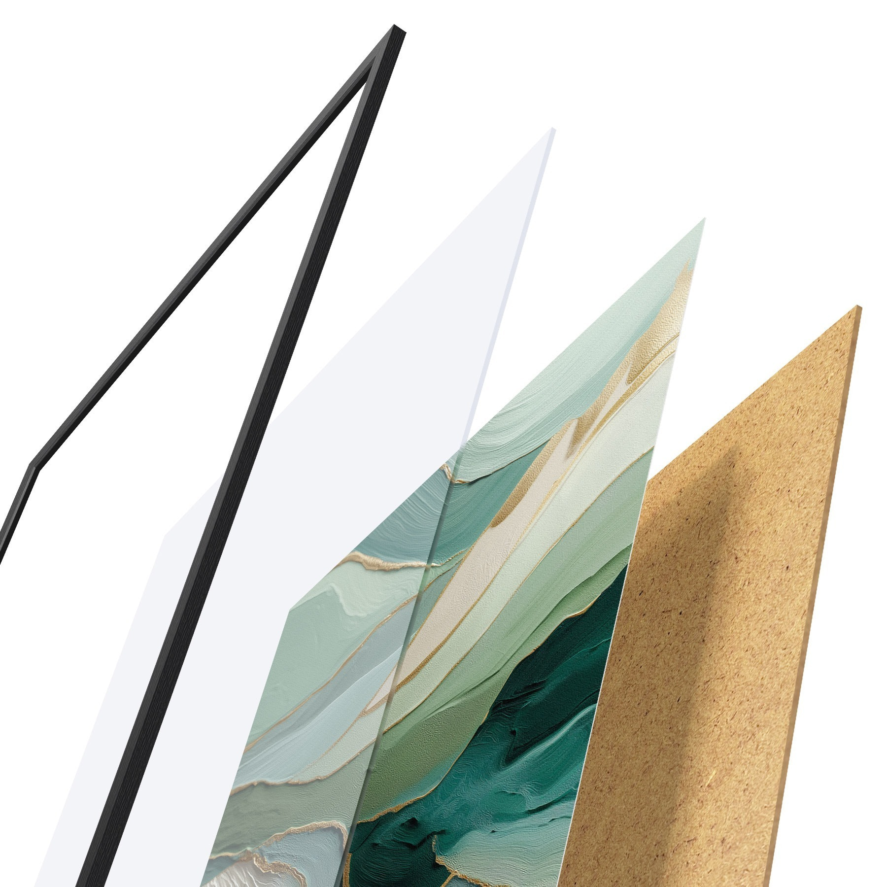 Plakat składa się z ramy, pleksi, wydrukowanego obrazu i podkładu z płyty wiórowej. Plakat można natychmiast zawiesić na ścianie dzięki uchwytom z tyłu.