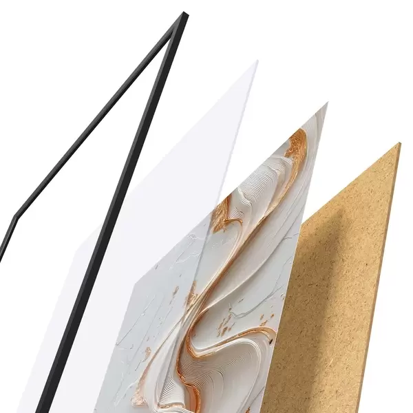 Plakat składa się z ramy, pleksi, wydrukowanego obrazu i podkładu z płyty wiórowej. Plakat można natychmiast zawiesić na ścianie dzięki uchwytom z tyłu.
