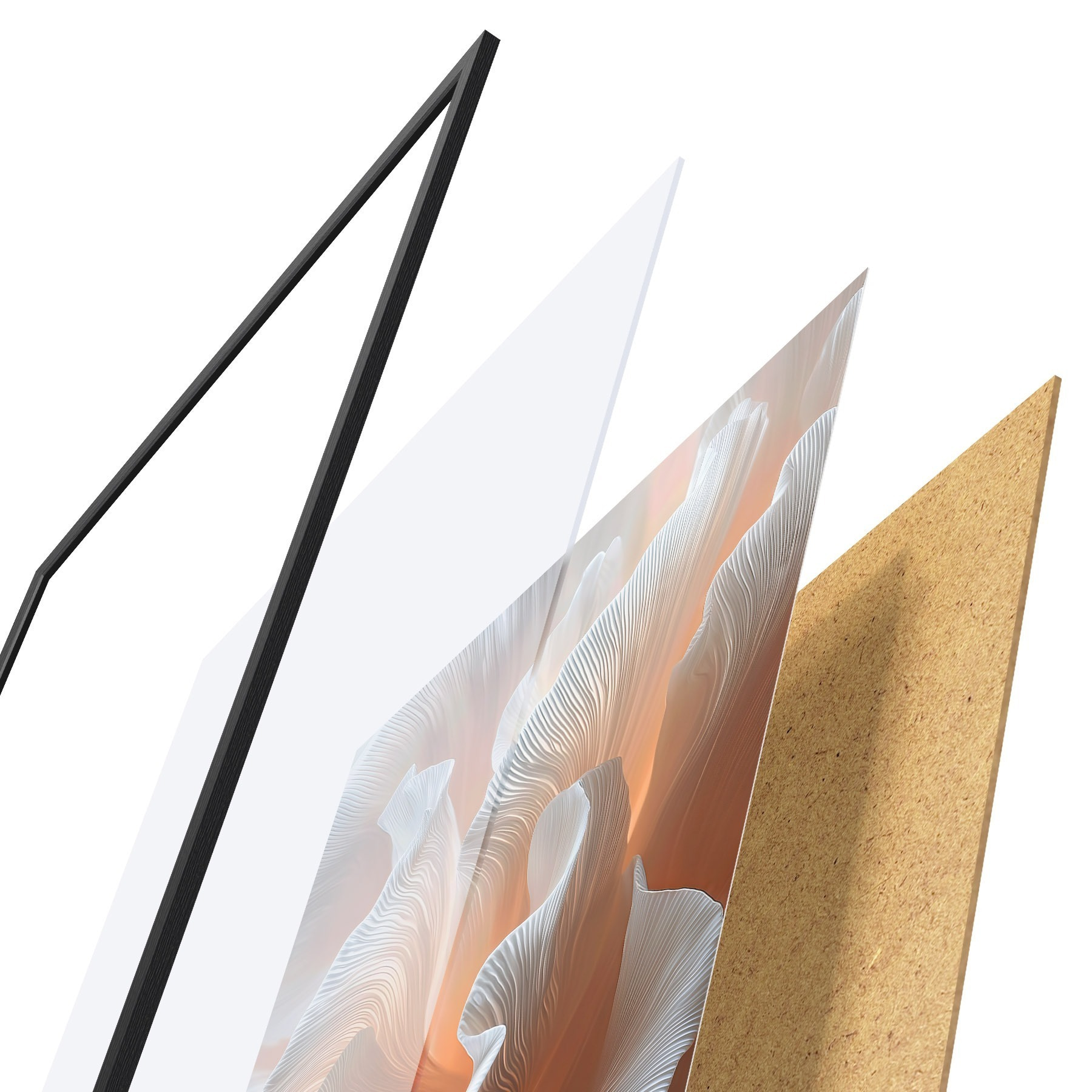 Plakat składa się z ramy, pleksi, wydrukowanego obrazu i podkładu z płyty wiórowej. Plakat można natychmiast zawiesić na ścianie dzięki uchwytom z tyłu.