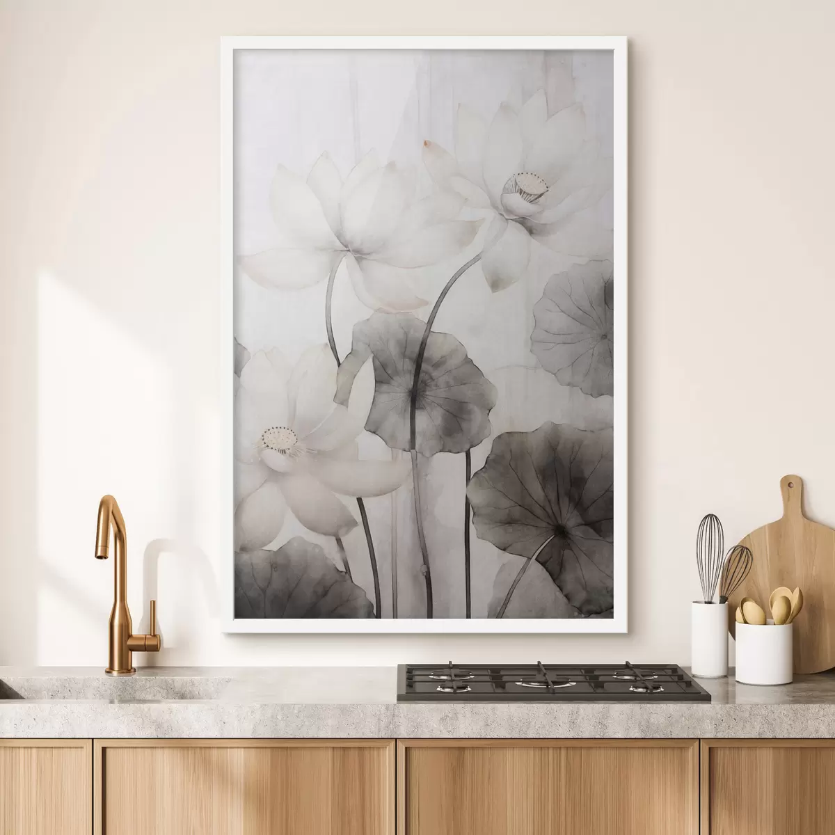 Poster Białe teksturowane kwiaty lotosu z ciemnymi liśćmi, jasnym tłem i minimalistycznym wzorem Nr f45937