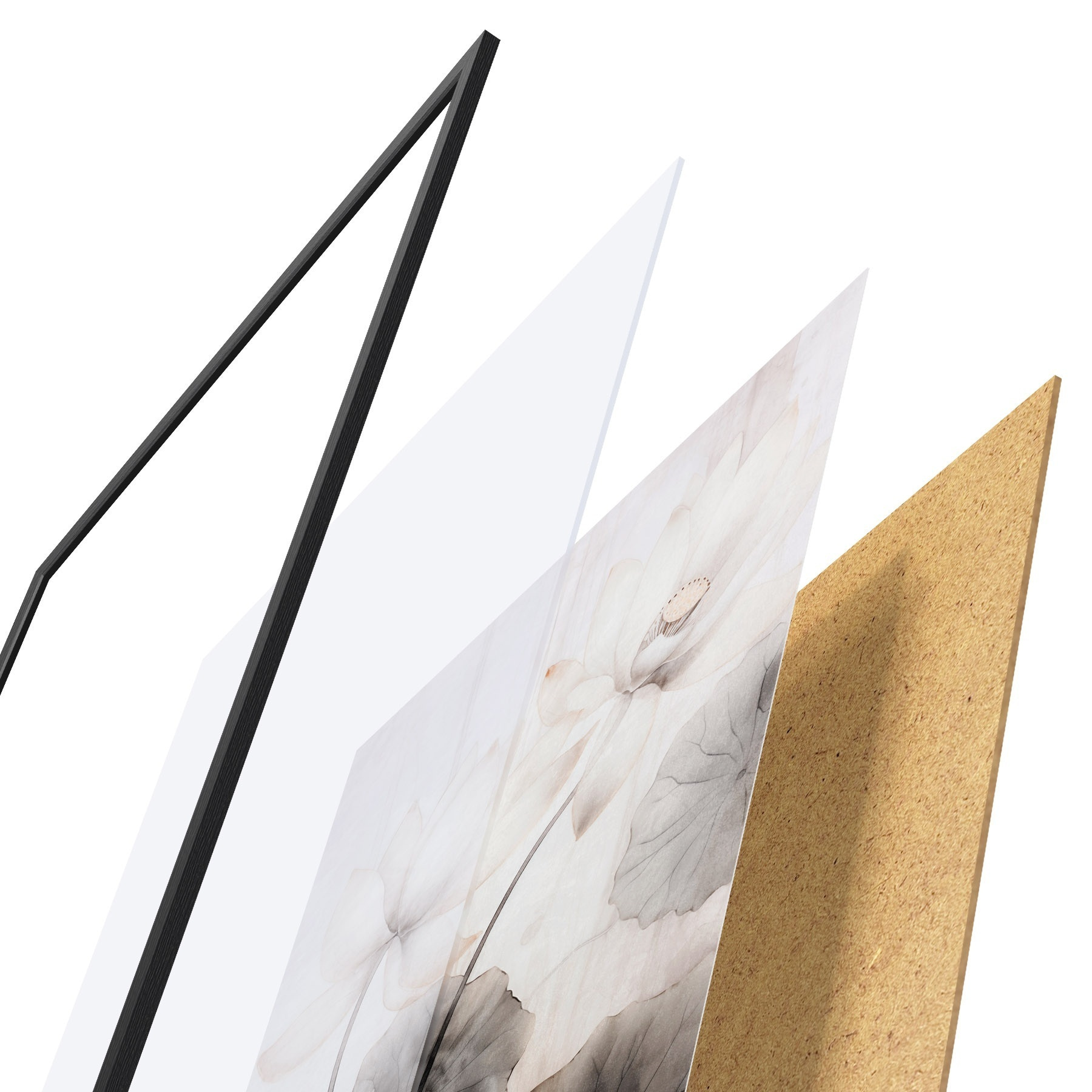 Plakat składa się z ramy, pleksi, wydrukowanego obrazu i podkładu z płyty wiórowej. Plakat można natychmiast zawiesić na ścianie dzięki uchwytom z tyłu.