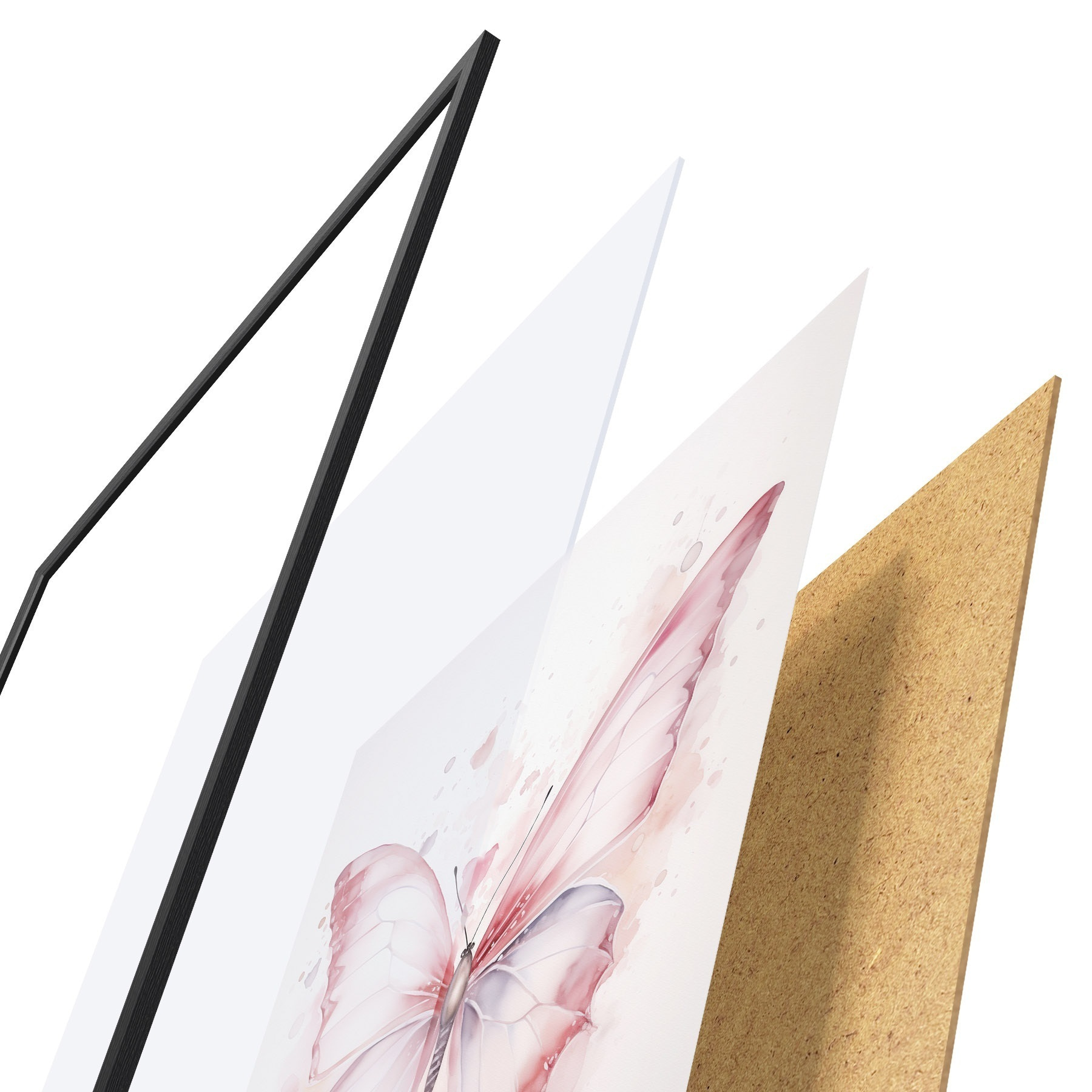 Plakat składa się z ramy, pleksi, wydrukowanego obrazu i podkładu z płyty wiórowej. Plakat można natychmiast zawiesić na ścianie dzięki uchwytom z tyłu.