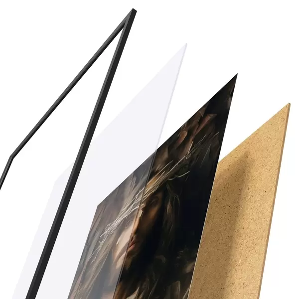 Plakat składa się z ramy, pleksi, wydrukowanego obrazu i podkładu z płyty wiórowej. Plakat można natychmiast zawiesić na ścianie dzięki uchwytom z tyłu.