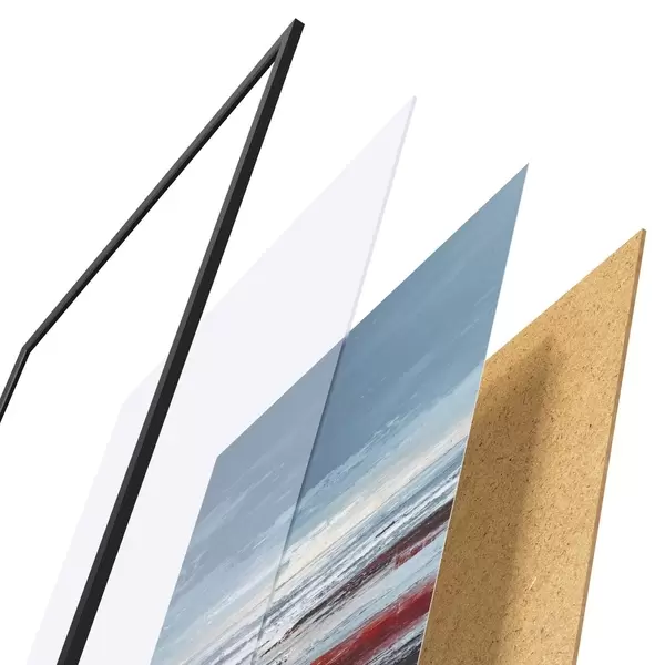 Plakat składa się z ramy, pleksi, wydrukowanego obrazu i podkładu z płyty wiórowej. Plakat można natychmiast zawiesić na ścianie dzięki uchwytom z tyłu.