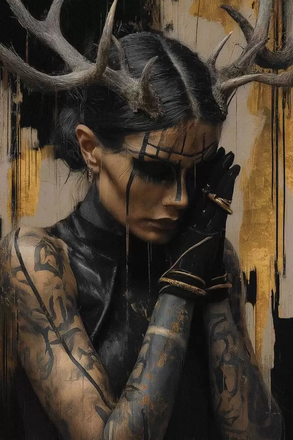 Plakat Kobieta z rogami w mrocznym wyglądzie z czarnymi liniami na twarzy f46144