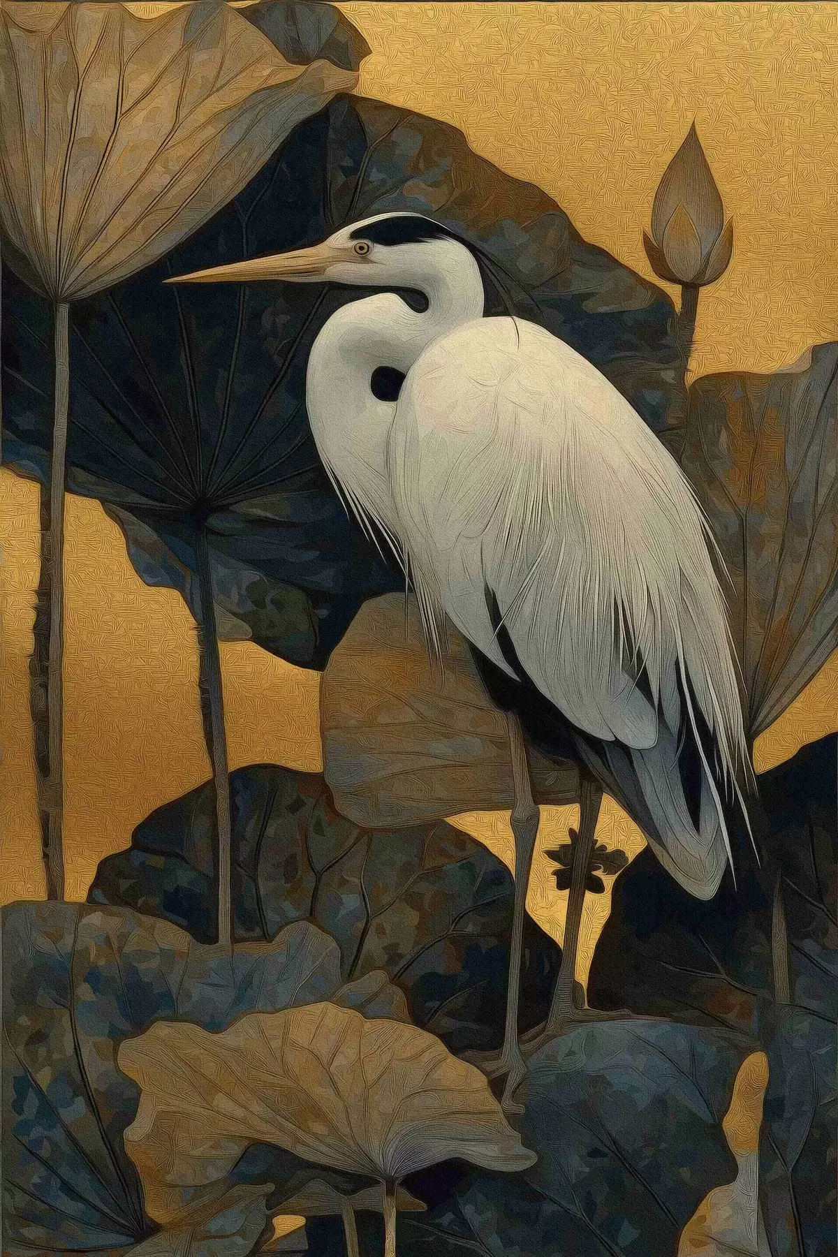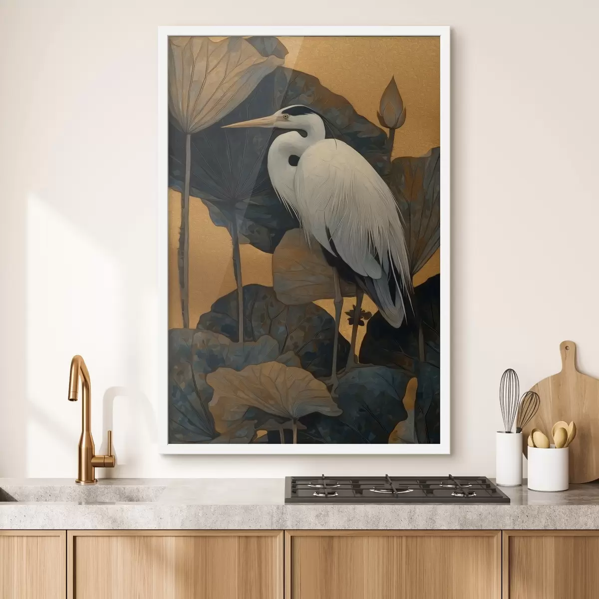 Poster Biała czapla wśród dużych liści na ciepłym tle Nr f46147