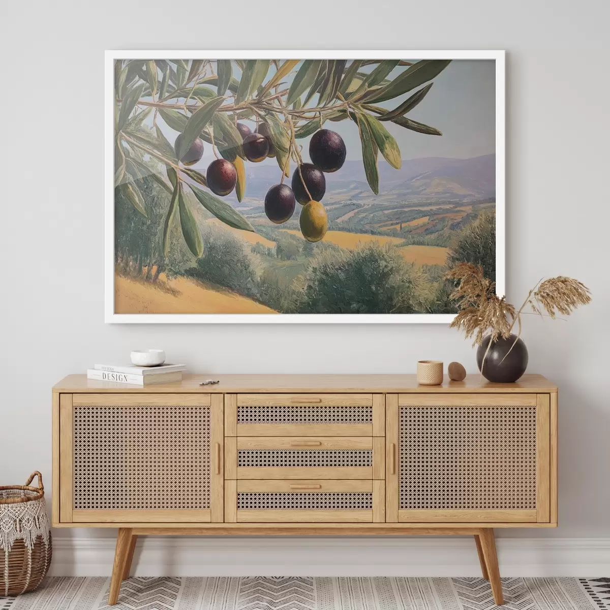 Plakat Gałązka oliwna z ciemnymi owocami na tle letniego krajobrazu f46150