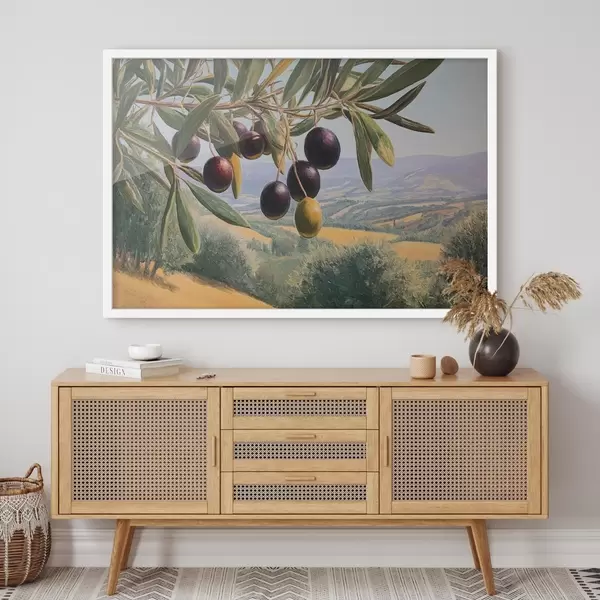 Poster Gałązka oliwna z ciemnymi owocami na tle letniego krajobrazu Nr f46150
