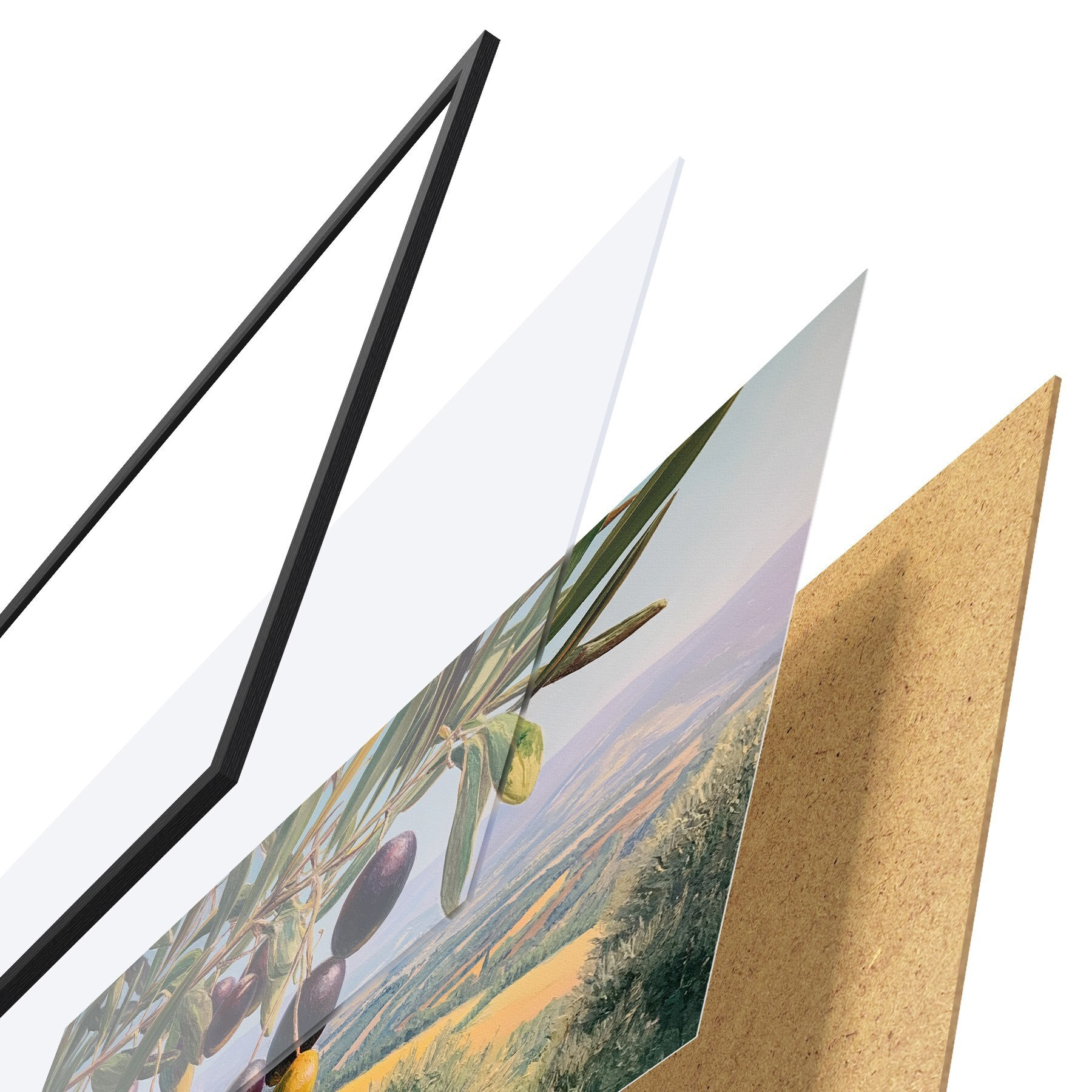 Plakat składa się z ramy, pleksi, wydrukowanego obrazu i podkładu z płyty wiórowej. Plakat można natychmiast zawiesić na ścianie dzięki uchwytom z tyłu.
