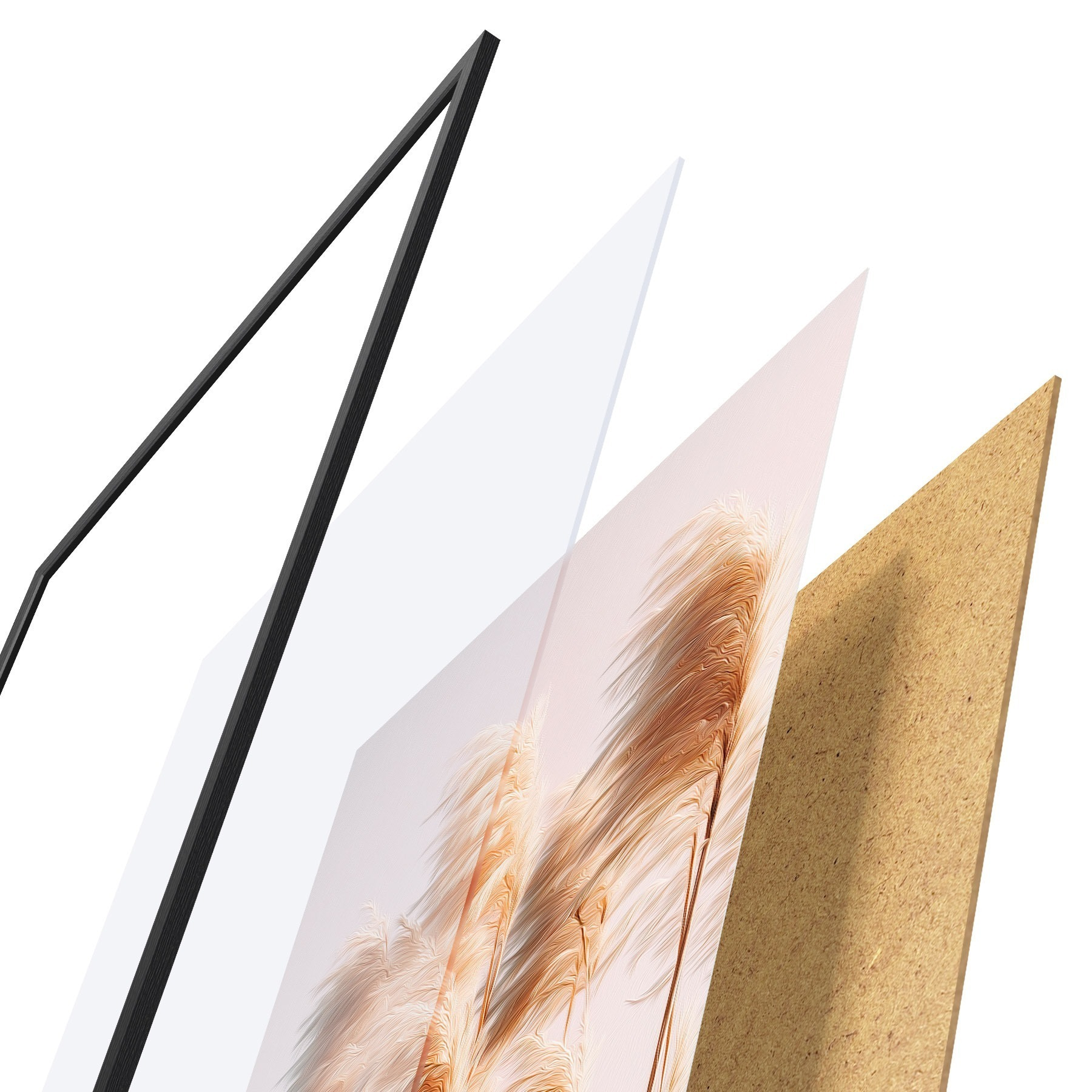 Plakat składa się z ramy, pleksi, wydrukowanego obrazu i podkładu z płyty wiórowej. Plakat można natychmiast zawiesić na ścianie dzięki uchwytom z tyłu.