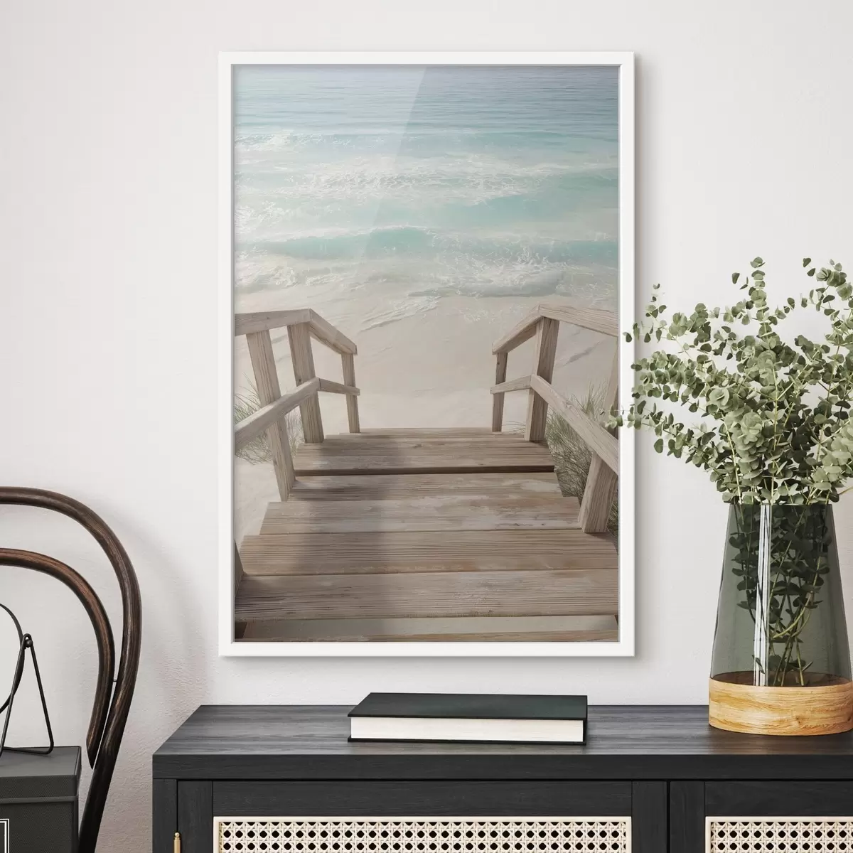 Plakat Drewniane schody prowadzące do turkusowej plaży f46163