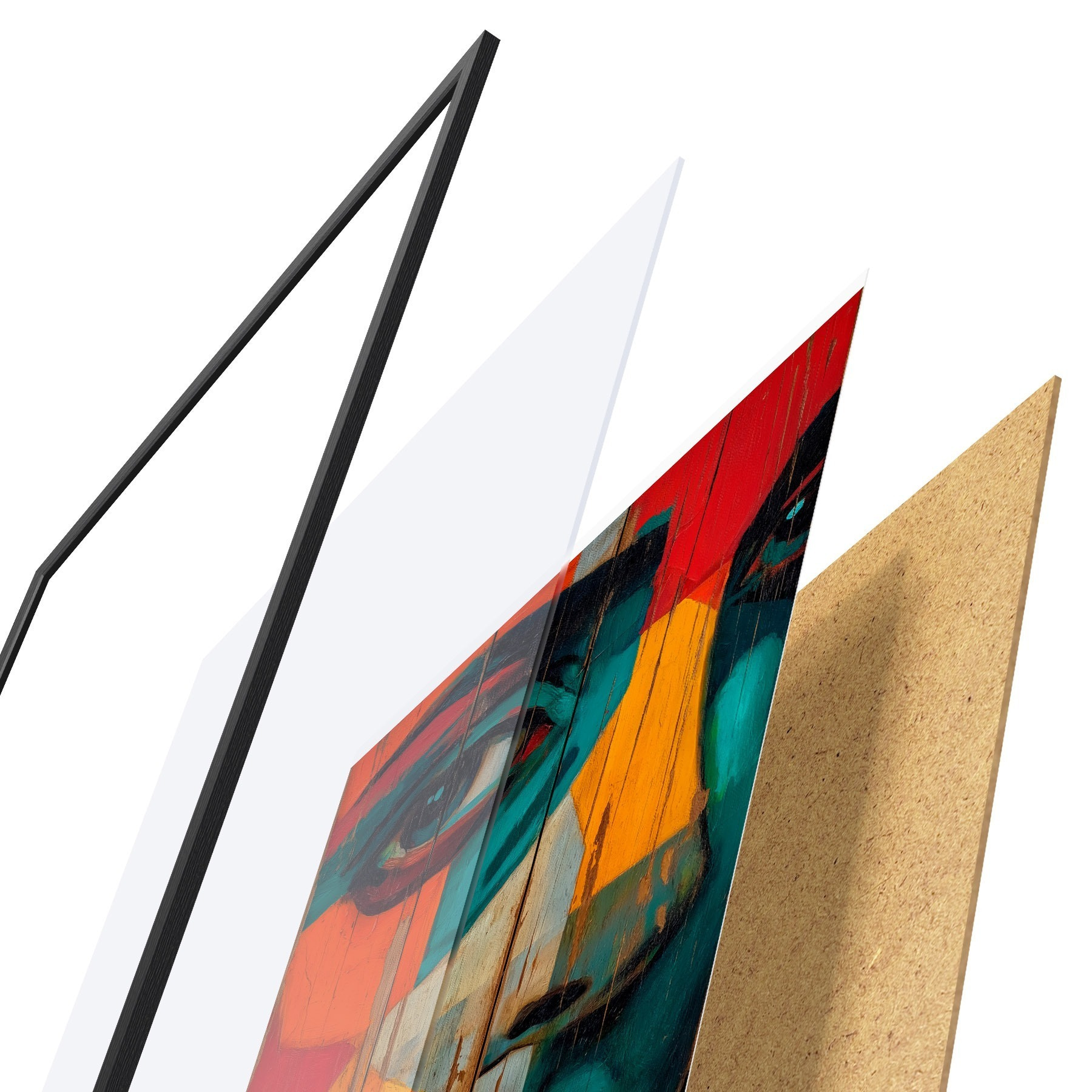 Plakat składa się z ramy, pleksi, wydrukowanego obrazu i podkładu z płyty wiórowej. Plakat można natychmiast zawiesić na ścianie dzięki uchwytom z tyłu.