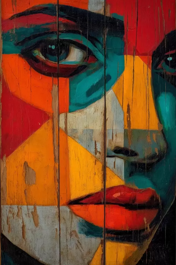 Plakat Jasny geometryczny portret twarzy na drewnianych deskach f46165