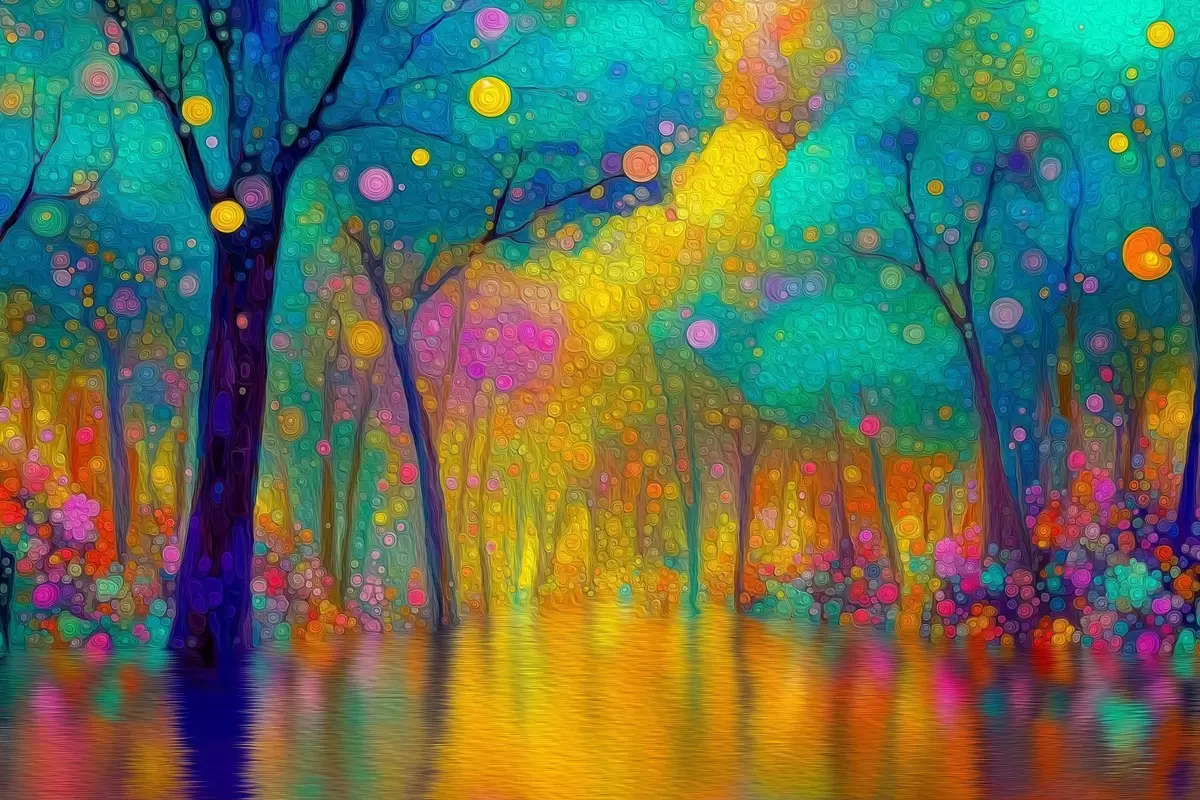 Poster Żywy, fantastyczny las z odbiciami w wodzie Nr f46171