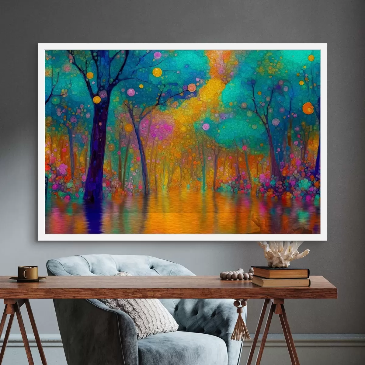 Sprzedajemy obrazy na blejtramie - jest to drewniana rama, na którą naciągnięte jest płótno. Tego obrazu nie trzeba oprawiać; można go powiesić bezpośrednio na ścianie.