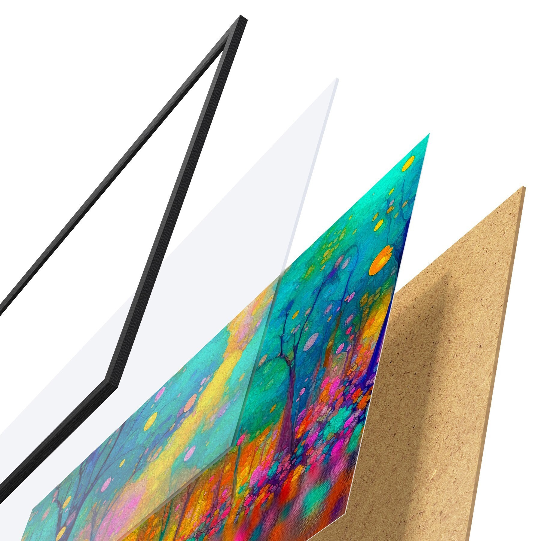 Plakat składa się z ramy, pleksi, wydrukowanego obrazu i podkładu z płyty wiórowej. Plakat można natychmiast zawiesić na ścianie dzięki uchwytom z tyłu.
