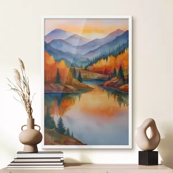 Plakat Jesienny krajobraz z górami odbijającymi się w spokojnym jeziorze f46174