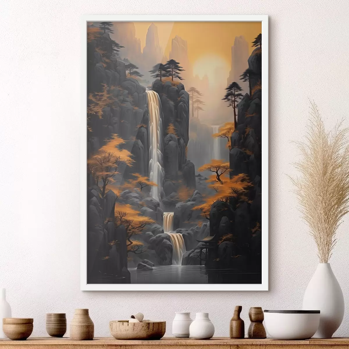 Plakat Skalisty krajobraz z wodospadem w ciepłych barwach zachodu słońca f46177