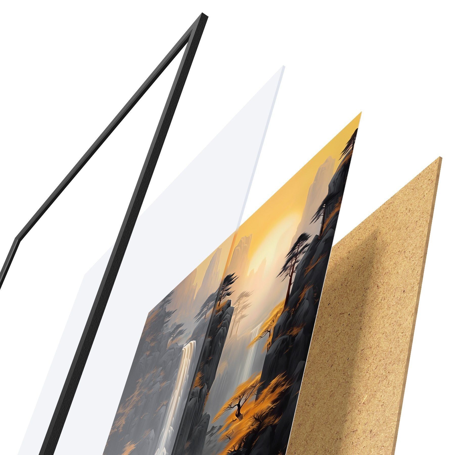 Plakat składa się z ramy, pleksi, wydrukowanego obrazu i podkładu z płyty wiórowej. Plakat można natychmiast zawiesić na ścianie dzięki uchwytom z tyłu.