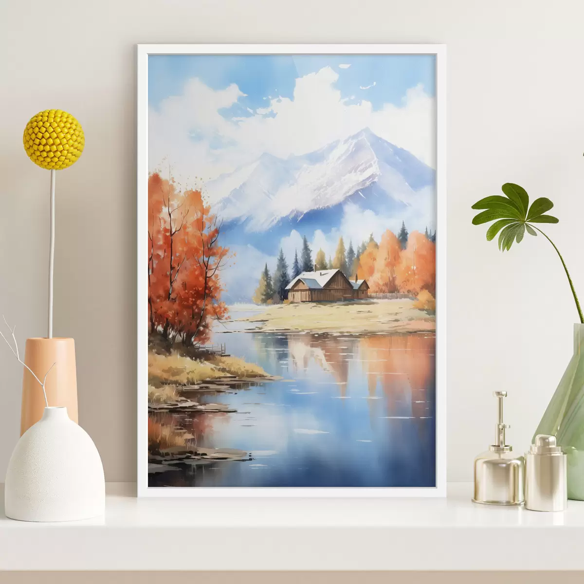 Plakat Jesienny krajobraz nad jeziorem z domem i górami f46184