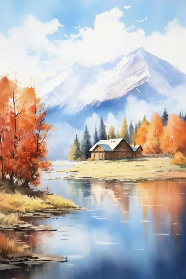 Plakat Jesienny krajobraz nad jeziorem z domem i górami f46184