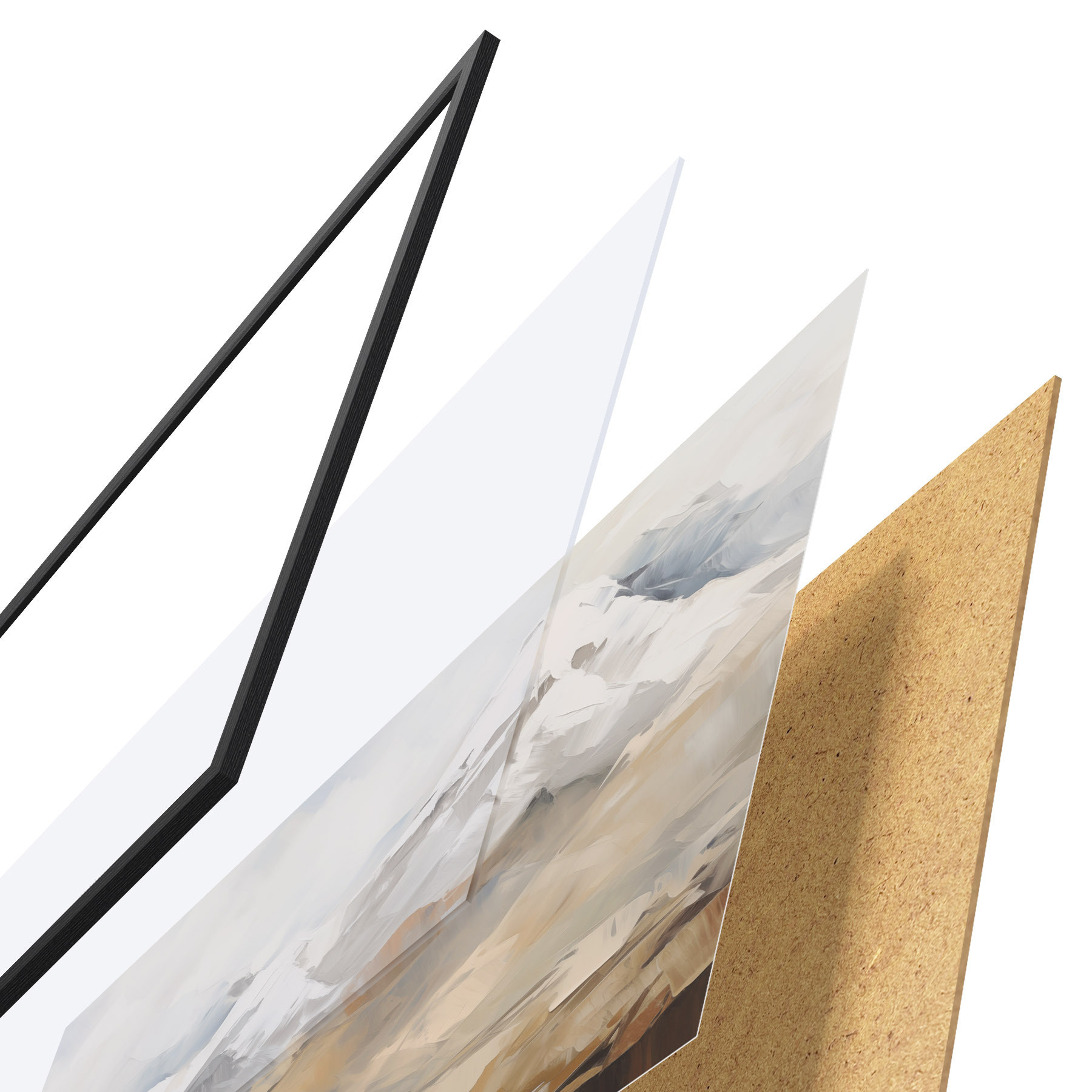 Plakat składa się z ramy, pleksi, wydrukowanego obrazu i podkładu z płyty wiórowej. Plakat można natychmiast zawiesić na ścianie dzięki uchwytom z tyłu.