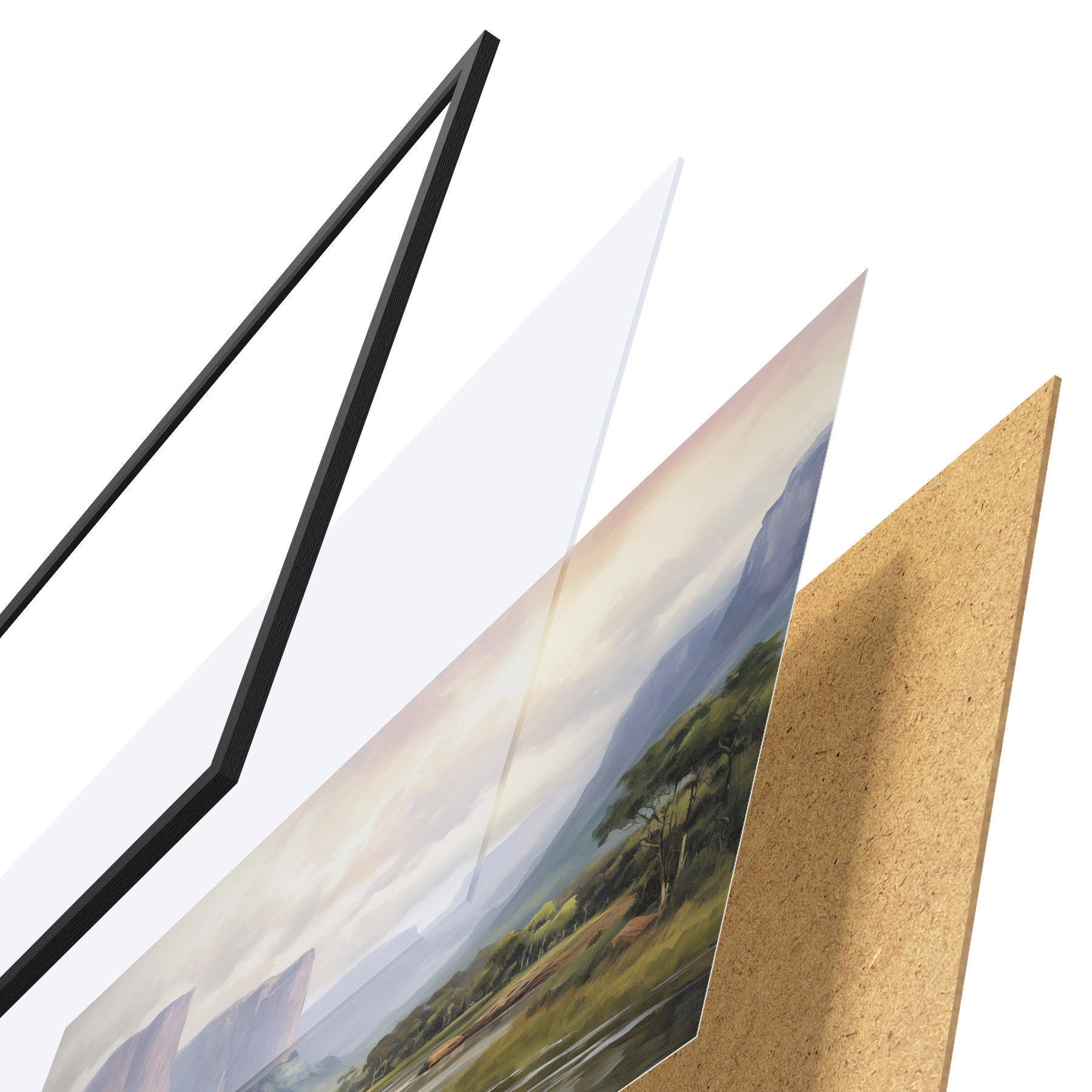 Plakat składa się z ramy, pleksi, wydrukowanego obrazu i podkładu z płyty wiórowej. Plakat można natychmiast zawiesić na ścianie dzięki uchwytom z tyłu.