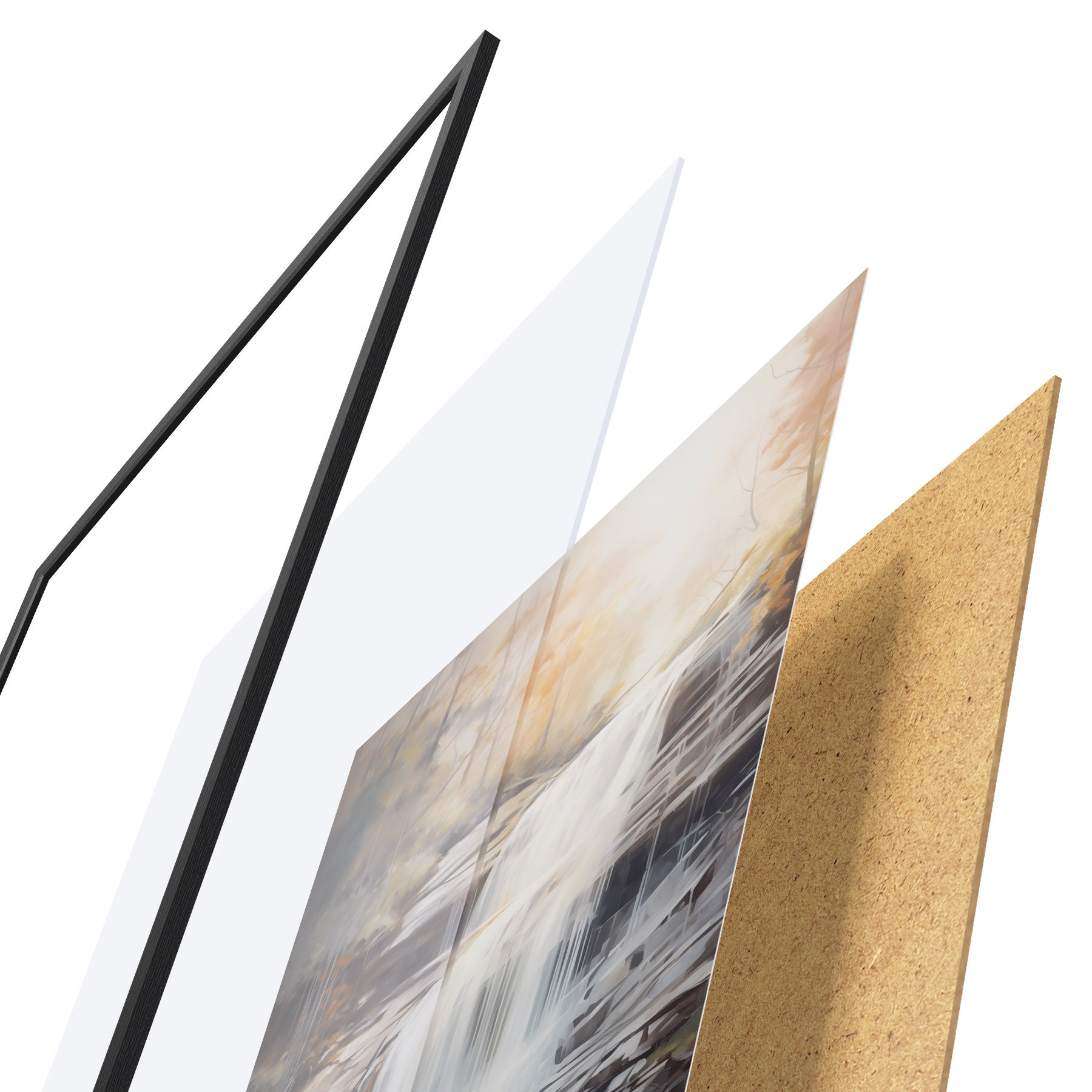 Plakat składa się z ramy, pleksi, wydrukowanego obrazu i podkładu z płyty wiórowej. Plakat można natychmiast zawiesić na ścianie dzięki uchwytom z tyłu.