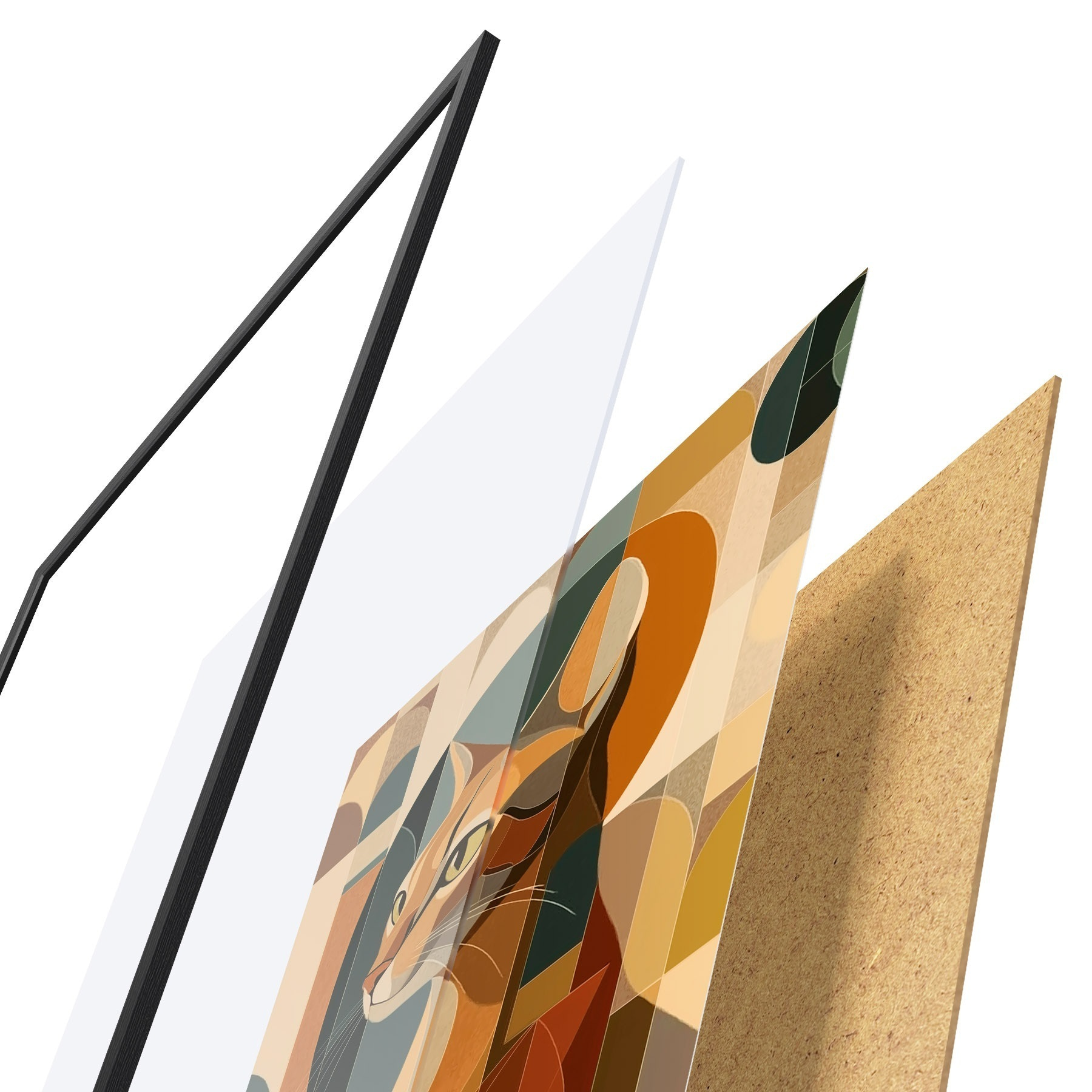 Plakat składa się z ramy, pleksi, wydrukowanego obrazu i podkładu z płyty wiórowej. Plakat można natychmiast zawiesić na ścianie dzięki uchwytom z tyłu.