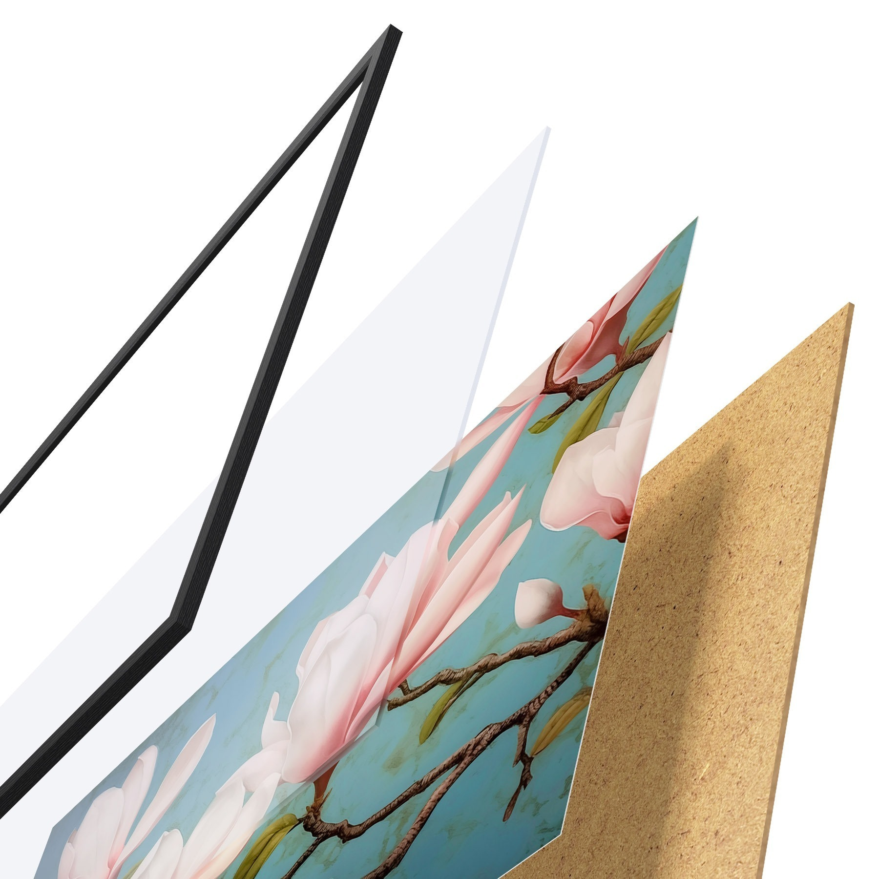 Plakat składa się z ramy, pleksi, wydrukowanego obrazu i podkładu z płyty wiórowej. Plakat można natychmiast zawiesić na ścianie dzięki uchwytom z tyłu.