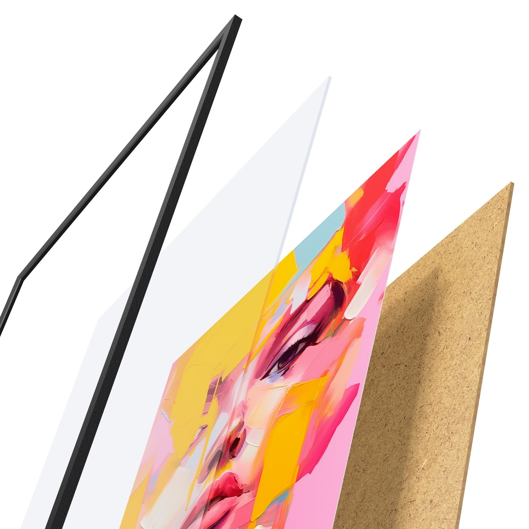 Plakat składa się z ramy, pleksi, wydrukowanego obrazu i podkładu z płyty wiórowej. Plakat można natychmiast zawiesić na ścianie dzięki uchwytom z tyłu.