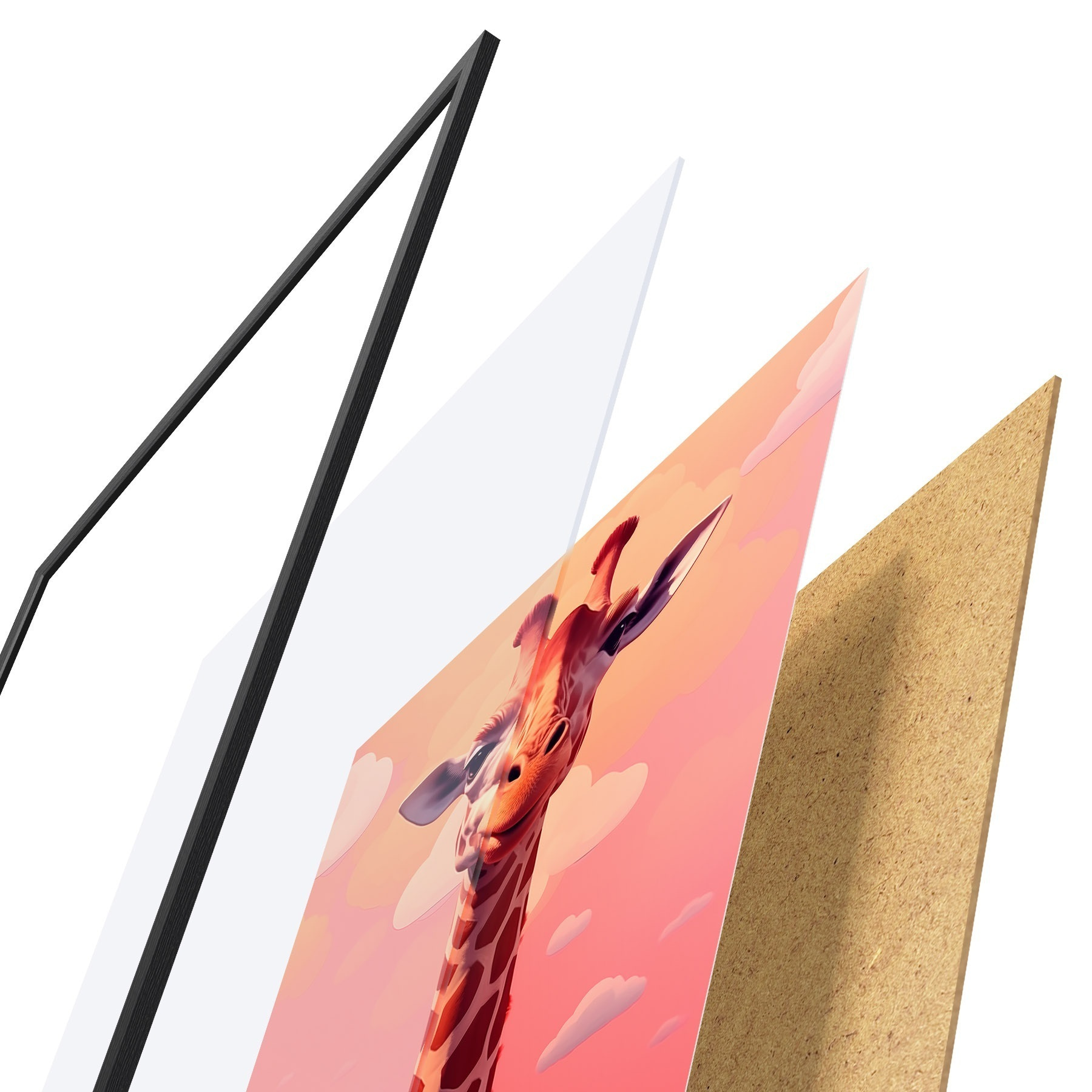 Plakat składa się z ramy, pleksi, wydrukowanego obrazu i podkładu z płyty wiórowej. Plakat można natychmiast zawiesić na ścianie dzięki uchwytom z tyłu.