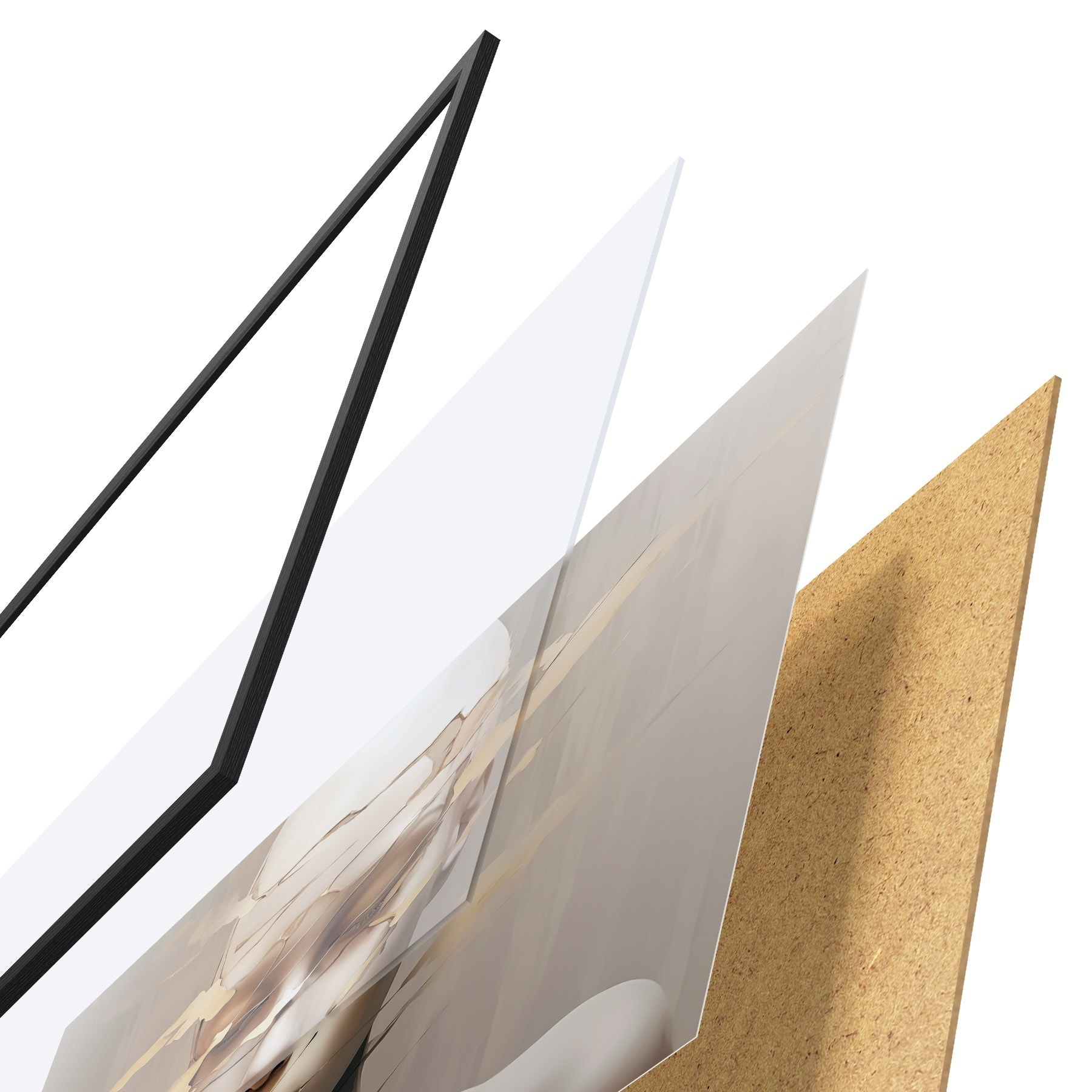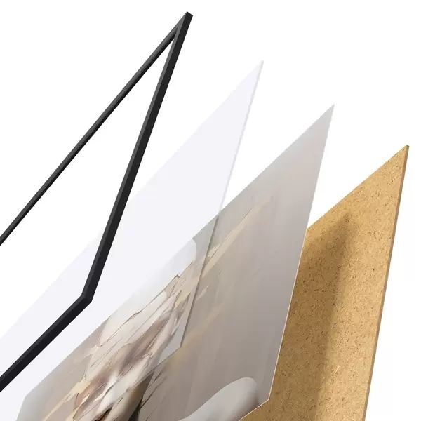 Plakat składa się z ramy, pleksi, wydrukowanego obrazu i podkładu z płyty wiórowej. Plakat można natychmiast zawiesić na ścianie dzięki uchwytom z tyłu.