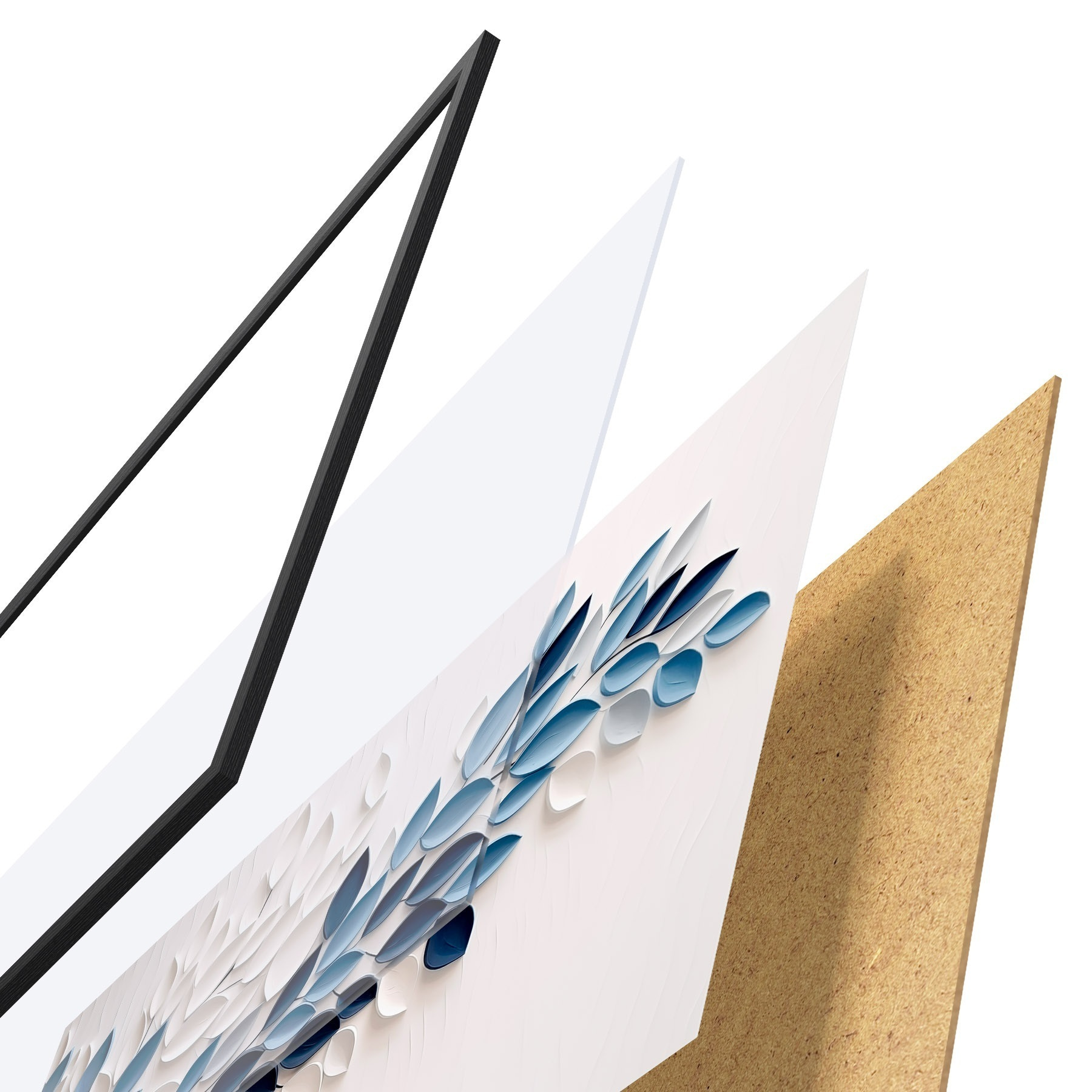Plakat składa się z ramy, pleksi, wydrukowanego obrazu i podkładu z płyty wiórowej. Plakat można natychmiast zawiesić na ścianie dzięki uchwytom z tyłu.